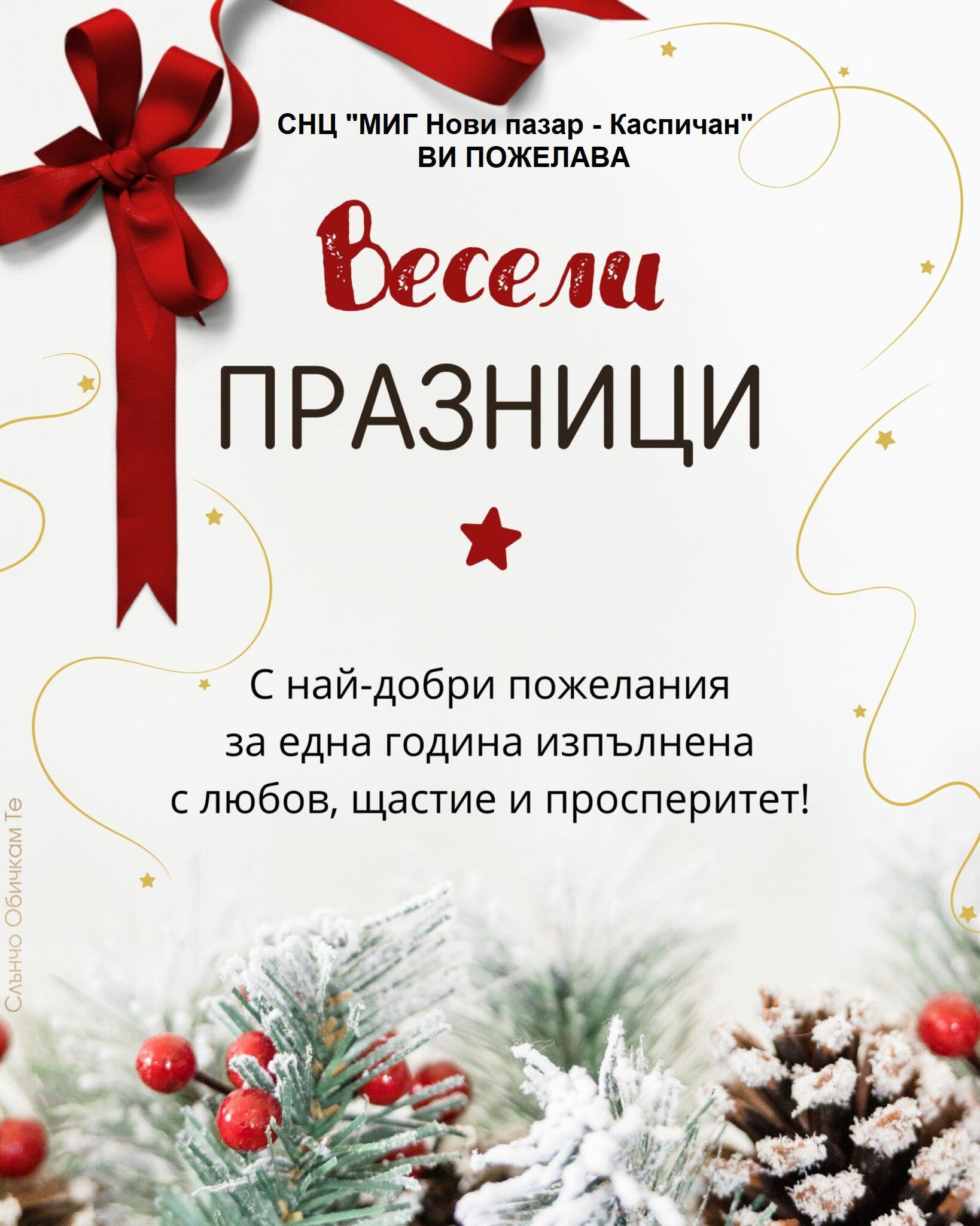 | Екипът на МИГ "Нови пазар - Каспичан" ви поздравява с настъпването на Коледните и Новогодишни празници и ви желае здраве и хармония!